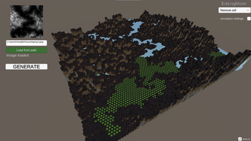 Water simulation is integrated and represented as rain. Water is reactive to changing the topography by adding/removing cells. Surface cells react to water by spawning ground cover models in places where water has been standing for a while. After water has been drained from the cell, the ground cover disappears.
